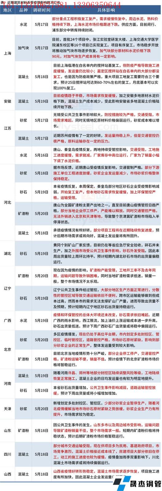 截至5月20日,據(jù)百年建筑網(wǎng)調(diào)研,13個(gè)省份建材市場(chǎng)受到了不同程度的影響。隨著華東、華南疫情和暴雨情況的緩解,物流運(yùn)輸逐步恢復(fù)正常,材料進(jìn)場(chǎng)速度加快,下游工地施工節(jié)奏提升。在疫情有效管控下,基建、房建方面的需求陸續(xù)回升,但由于疫情反復(fù)抬頭的影響,仍有上行空間有限。具體情況如下: