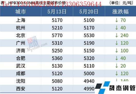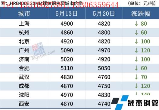 據(jù)監(jiān)測(cè),截至5月20日,全國主要城市20mm三級(jí)抗震螺紋鋼均價(jià)4849元/噸,較5月13日下跌107元/噸;8.0mmHPB300高線均價(jià)5101/噸,較5月7日下跌104元/噸。