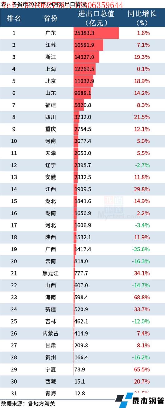 出口方面,今年前4個月,我國出口6.97萬億元,同比增長10.3%。分省市來看,廣東以15955億元的數(shù)值位列第一,同比增長5.1%;廣東、浙江、江蘇1-4月出口均超萬億元。從同比增速來看,共有26個省市實現(xiàn)正增長,其中19個省市增速超出10.3%的平均水平。西藏以179%的同比增速位居第一,海南、寧夏分別以89.6%和82.4%的增速排名第二、三位。此外,5個省市實現(xiàn)負(fù)增長,分別是北京、山西、貴州、廣西和云南,云南以-41.4%的增速位居末位。