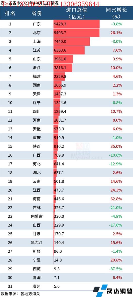 進口方面,今年前4個月,我國進口5.61萬億元,同比增長5%。分省市來看,廣東以9428.3億元的數(shù)值排名第一,同比下降3.8%;廣東、北京、上海、江蘇1-4月進出口均超5千億元。從同比增速來看,共有20個省市實現(xiàn)正增長,其中13個省市增速超出10.3%的平均水平。海南以62.8%的同比增速位居第一,陜西增長35%排名第二,北京增長26.1%排名第三。此外,共有11個省市進口同比實現(xiàn)負(fù)增長,分別是重慶、新疆、上海、廣東、內(nèi)蒙古、遼寧、廣西、河北、山西、吉林和西藏,西藏以-87.5%的增速位居末尾。