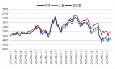 從年初開始,本地市場(chǎng)價(jià)格是處于4900元/噸的水平,對(duì)比歷年來(lái)講這個(gè)價(jià)格算是偏高的,到2月10號(hào)之前基本上處于小幅平穩(wěn)上漲的態(tài)勢(shì),出現(xiàn)了一個(gè)小極值在5150元/噸,第二個(gè)高點(diǎn)出現(xiàn)在3月8號(hào)左右,價(jià)格處于5350元/噸左右,此時(shí)周邊市場(chǎng)開始受到疫情管控的影響,資源運(yùn)輸不暢,倉(cāng)庫(kù)提貨困難,市場(chǎng)價(jià)格開始大幅下行,到三月中旬總共下跌了300元/噸,下半月市場(chǎng)需求情況受傳統(tǒng)旺季提振有一定恢復(fù),到3月底四月初達(dá)到了第三個(gè)高點(diǎn)5370元/噸的水平,也是目前為止的最高點(diǎn),和去年上半年高點(diǎn)相比大幅下降。從4月初一直到現(xiàn)在,中間雖然有階段性反彈,但是價(jià)格趨勢(shì)整體呈現(xiàn)震蕩下跌的態(tài)勢(shì),目前處于4890元/噸的水平,基本上平了2022年年初的水平。