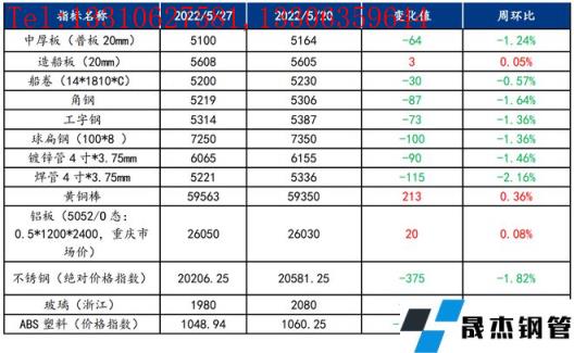 截止2022年5月27日,各原材料當日即時價格以及價格周環(huán)比情況如下: