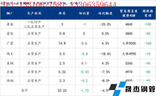 山東優特無縫厚壁鋼管廠家庫存33.24萬噸,環比下降1.73萬噸,降幅4.9%,同比增加5.51萬噸,增幅19.88%。生產方面:魯麗一軋停產,二軋正常生產;臨沂江泉停產,其他無縫厚壁鋼管廠家正常生產。