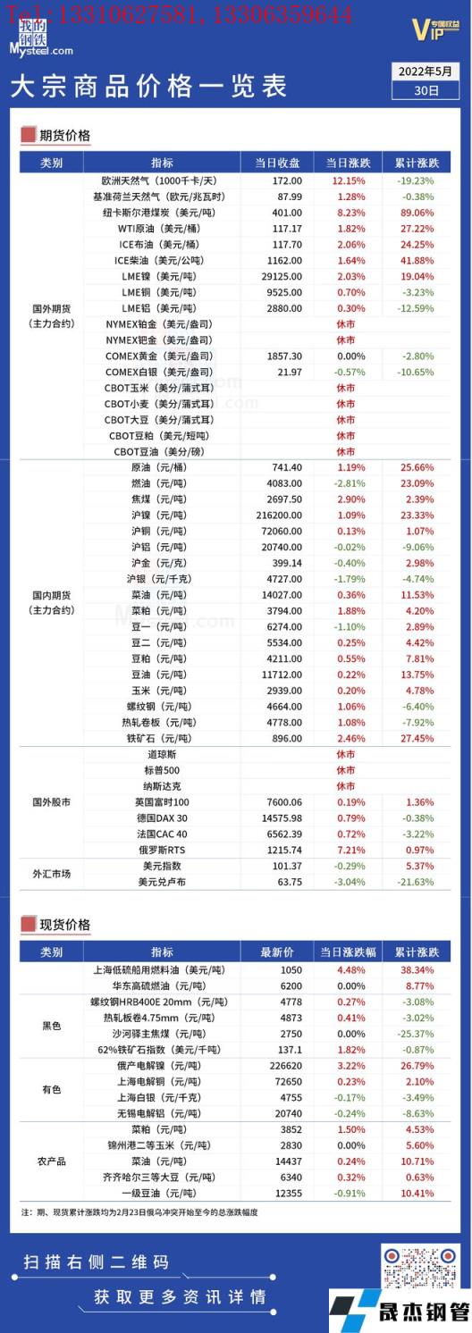 免責聲明:本網站(山東聊城晟杰無縫鋼管廠m.cars-guide.cn)刊載的“俄烏局勢丨大宗商品價格一覽表(5月30日)”等均源于網絡,版權歸原作者所有,且僅代表原作者觀點,本文所載信息僅供參考。轉載僅為學習與交流之目的,如無意中侵犯您的合法權益,請及時聯系刪除。本網站刊登此篇文章并不意味著本站贊同其觀點或證實其內容的真實性,我們不對其科學性、嚴肅性等作任何形式的保證。如果侵犯了您的版權,請盡快聯系我們予以撤銷,謝謝合作!