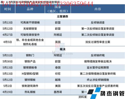 據(jù)不完全統(tǒng)計(jì),2022年4-5月中國(guó)貿(mào)易救濟(jì)信息網(wǎng)陸續(xù)公布了11起國(guó)外對(duì)中國(guó)鋼鐵產(chǎn)品發(fā)起的反傾銷、反補(bǔ)貼調(diào)查或裁決。涉案品種包括可再裝不銹鋼桶、無(wú)縫鋼鐵管、可鍛性鑄鐵管件、鋼制門、鍍錫鋼板卷、H型鋼和I型鋼、鍍鋅鋼板和熱軋鋼板等。具體如下:
