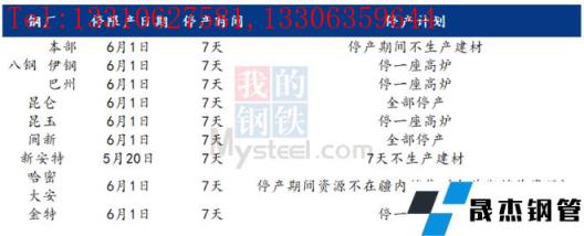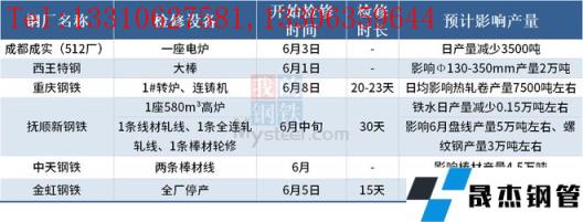 據不完全統計,截至6月7日,國內6家無縫厚壁鋼管廠家發布檢修計劃。其中,撫順新鋼鐵計劃6月中旬起對廠內1座580m3高爐進行30天左右的年修,預計鐵水日產量減少0.15萬噸左右、共影響鐵水產量4.5萬噸左右;同時1條線材軋線、1條全連軋軋線、1條棒材輪修,預計影響6月盤線產量5萬噸左右、螺紋鋼產量3萬噸左右。