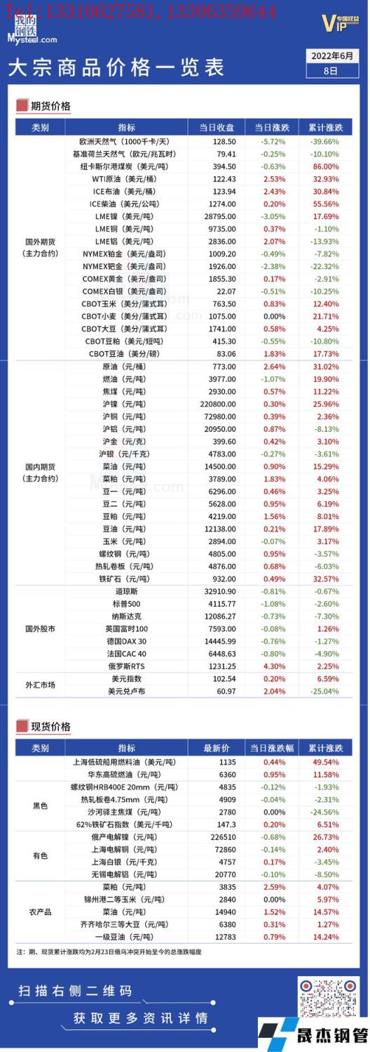 免責聲明:本網站(山東聊城晟杰無縫鋼管廠m.cars-guide.cn)刊載的“俄烏局勢丨大宗商品價格一覽表(6月8日)”等均源于網絡,版權歸原作者所有,且僅代表原作者觀點,本文所載信息僅供參考。轉載僅為學習與交流之目的,如無意中侵犯您的合法權益,請及時聯系刪除。本網站刊登此篇文章并不意味著本站贊同其觀點或證實其內容的真實性,我們不對其科學性、嚴肅性等作任何形式的保證。如果侵犯了您的版權,請盡快聯系我們予以撤銷,謝謝合作!