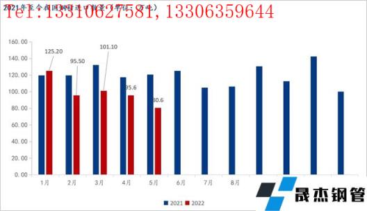5月中國進(jìn)口厚壁無縫鋼管80.6萬噸,較上月減少15萬噸,同比下降33.4%;1-5月累計(jì)進(jìn)口厚壁無縫鋼管498.0萬噸,同比下降18.3%。