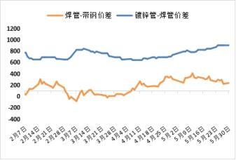 5月焊管較帶鋼價差由高位逐步收窄,結(jié)算周期內(nèi)焊管廠平均利潤13元,架子管月內(nèi)平均虧損51元;鍍鋅管較焊管價差有所走擴。5月焊鍍管廠綜合生產(chǎn)利潤得以改善。