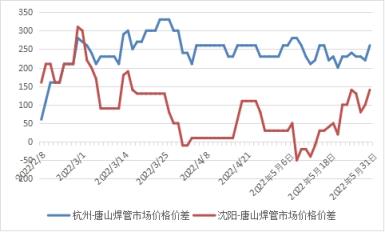 圖3 2022年唐山-杭州焊管、沈陽-唐山價差走勢圖
