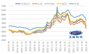 6月份,市場需求淡季特征較為明顯,北方高溫和南方雨季都影響了正常的施工節奏,下游實際采購需求釋放力度受限嚴重,疊加成本支撐力度的減弱,國內厚壁鋼管市場呈現明顯的弱勢下跌行情。據云商平臺監測數據顯示,截至6月底,全國厚壁鋼管綜合價格為4672元,較上月末下跌412元,環比跌幅為8.1%,年同比下跌14.0%。其中,長材價格為4452元,較上月末下跌404元,跌幅8.3%,年同比下跌11.9%;板材價格為4755元,較上月末下跌415元,跌幅為8.0%,年同比下跌16.5%;型材價格指數為4750元,較上月末下跌432元,跌幅為8.3%,年同比下跌12.8%;管材價格為5311元,較上月末下跌421元,跌幅為7.4%,年同比下跌11.4%(詳見圖1)。
