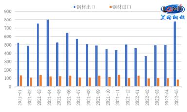 進口方面,由于國內疫情對制造業的沖擊仍存,且海外市場價格優勢不足,進口仍呈下降態勢。5月份,我國進口厚壁鋼管80.6萬噸,環比下降16.0%,同比下降33.2%;1-5月累計進口厚壁鋼管498.0萬噸,同比下降18.3%。