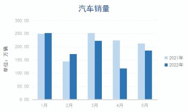 5月,受利好消息影響,汽車產銷明顯增長。據中汽協數據,5月,汽車產銷分別完成192.6萬輛和186.2萬輛,環比分別增長59.7%和57.6%,同比分別下降5.7%和12.6%。1-4月,汽車產銷分別完成961.8萬輛和955.5萬輛,同比分別下降9.6%和12.2%。