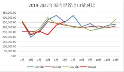 據海關最新統計顯示,2022年6月我國出口焊管35.96萬噸,環比增長12.18%;進口焊管1.11萬噸,環比增長5.97%;凈出口焊管34.85萬噸,較上月增長11.02%。1-6月凈出口量172.12萬噸,同比下降5.64%,處于三年均值以下水平,6月出口量在國內焊管產量的占比回升至6.82%。