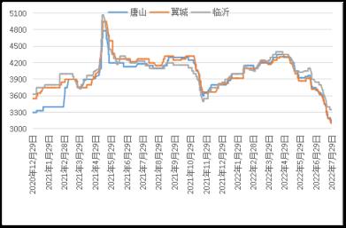 據(jù)云商平臺(tái)監(jiān)測(cè)數(shù)據(jù)顯示,截至7月29日,煉鋼生鐵天津地區(qū)報(bào)價(jià)3120元(噸價(jià),下同),較月初跌550元;唐山地區(qū)報(bào)價(jià)3150元,較月初跌550元;翼城地區(qū)報(bào)價(jià)3100元,較月初跌620元;臨沂地區(qū)報(bào)價(jià)3350元,較月初跌500元(詳見圖2)。
