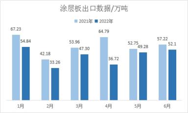 2022年6月我國涂層板(帶)出口總量共計52.10萬噸,月環比上升5.73%,年同比下降8.94%。2022年1-6月我國涂層板(帶)出口總量共計273.49萬噸,年同比下降19.12%。